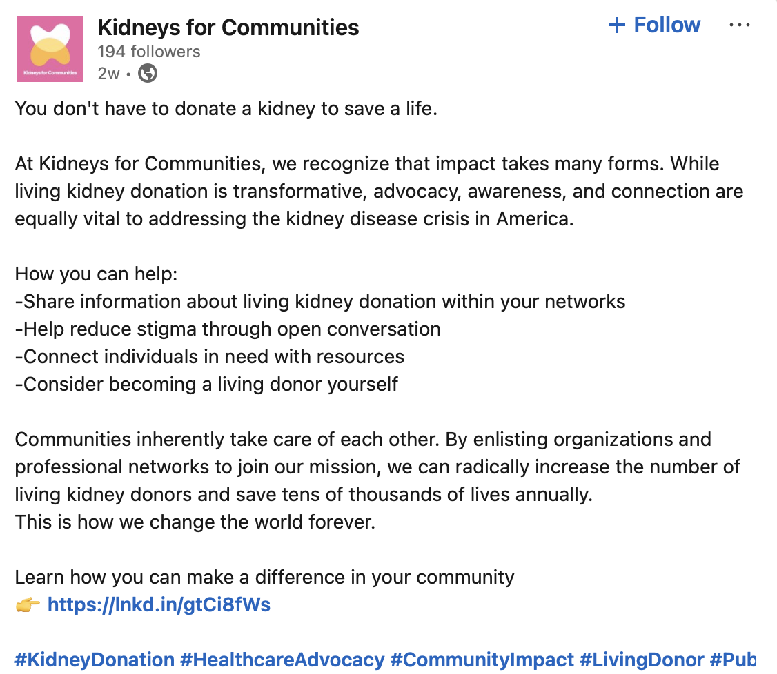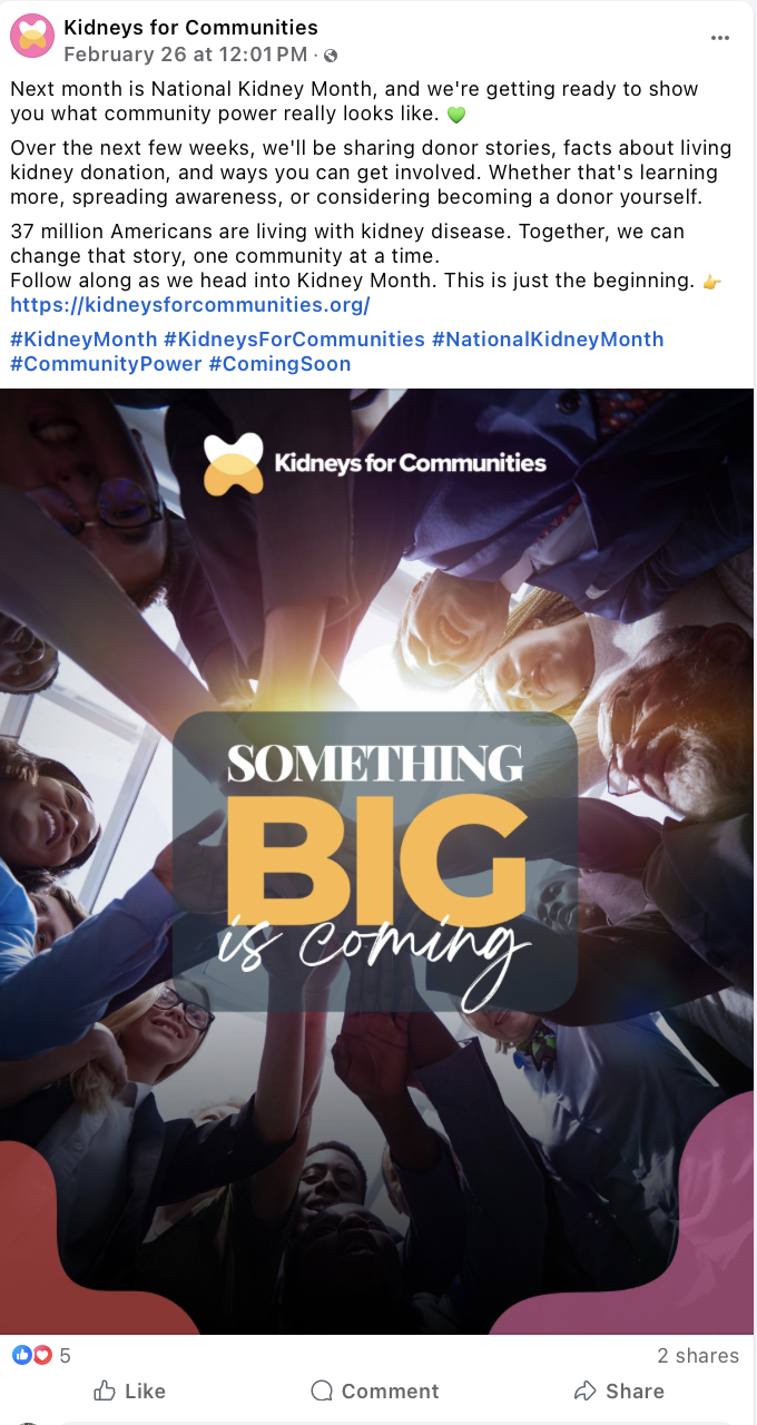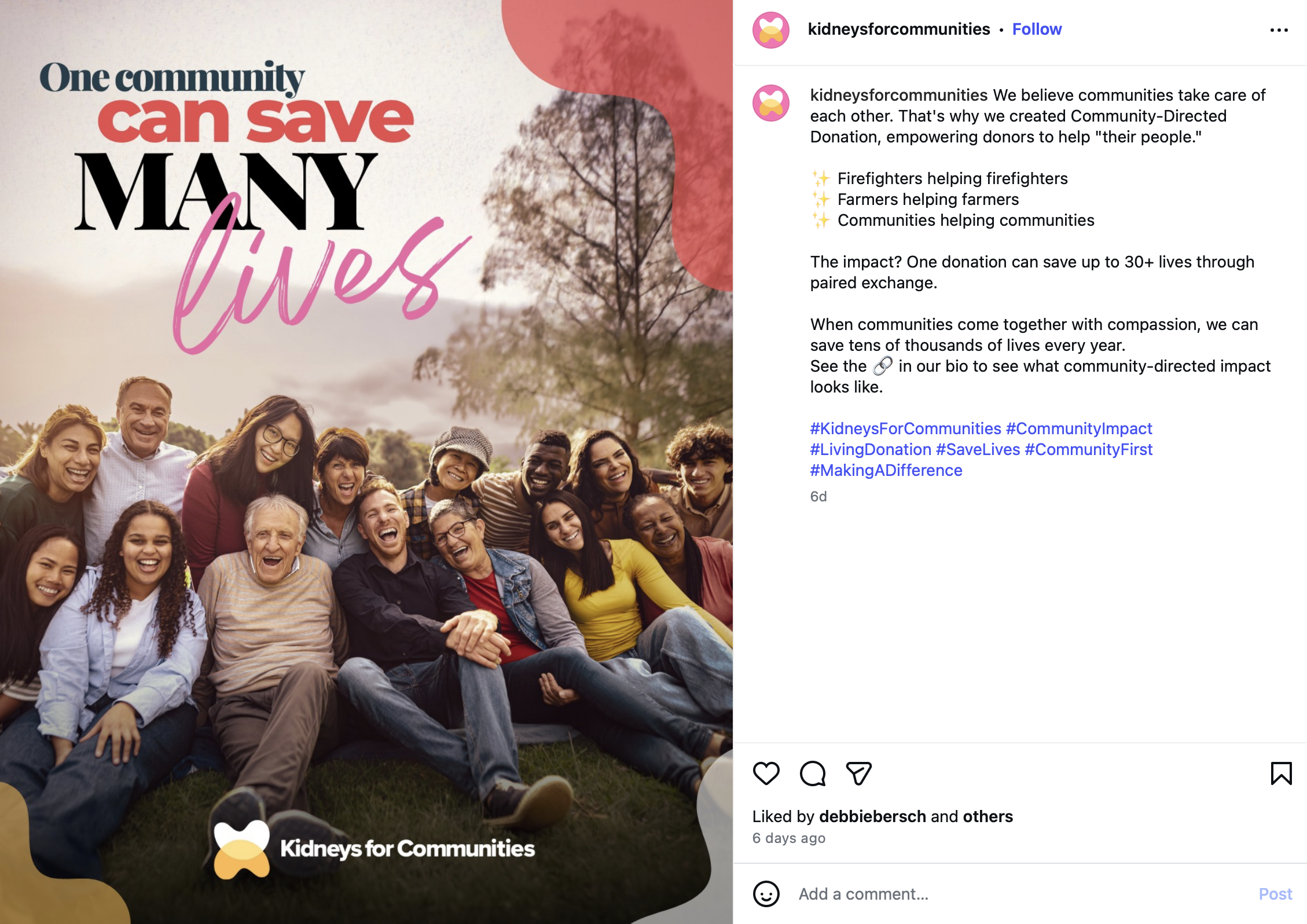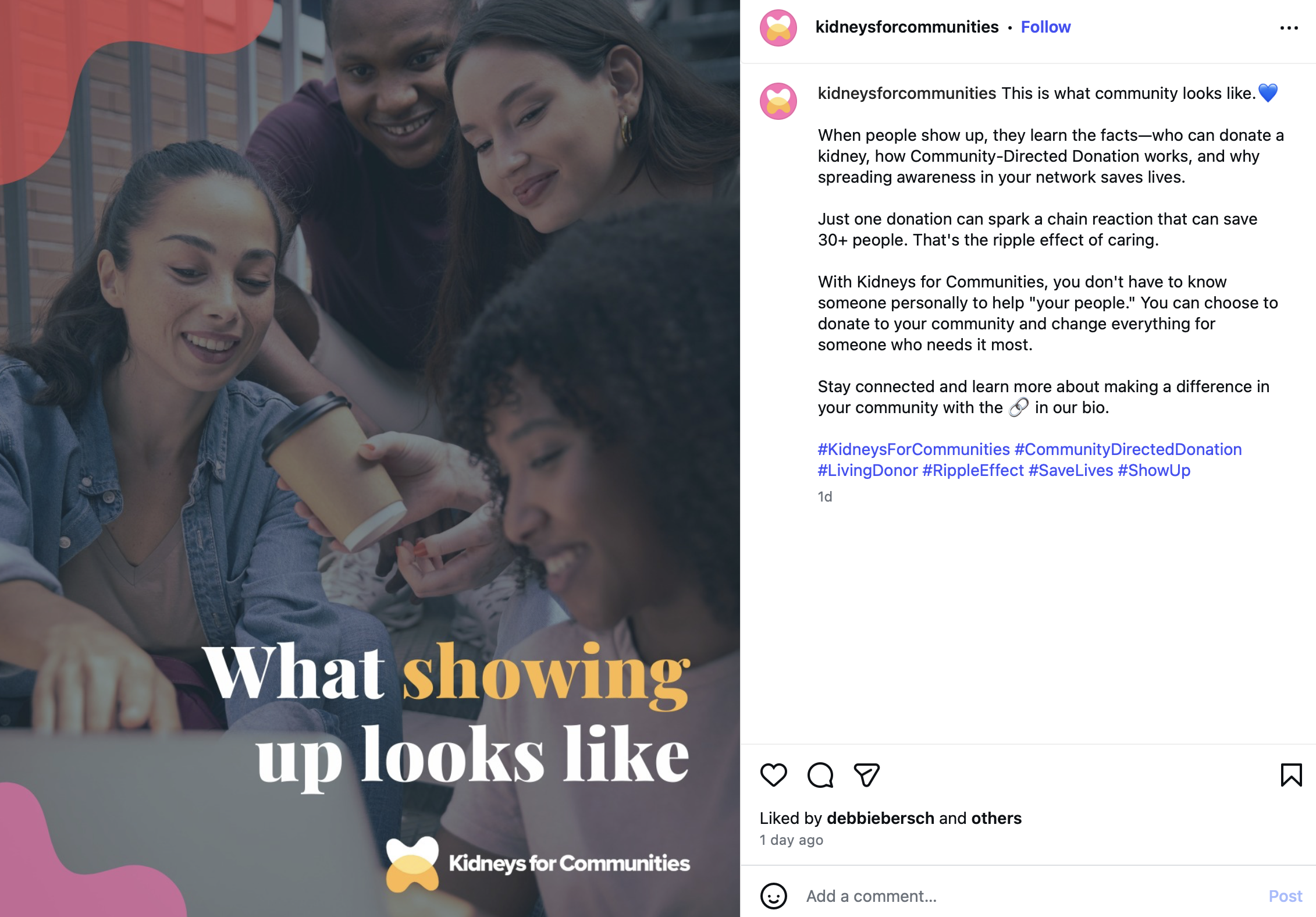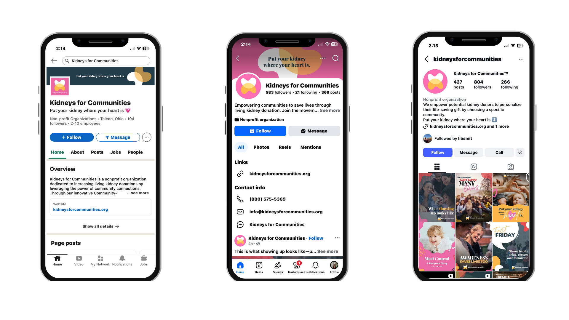 As the social media support for Kidneys for Communities — a nonprofit dedicated to building community around kidney donation and kidney health awareness — I helped implement their social strategy to drive program awareness. Over the course of my time supporting K4C, the content I created across Facebook, Instagram, and LinkedIn contributed to a 23% increase in followers and a 9.35% increase in engagement across all platforms.