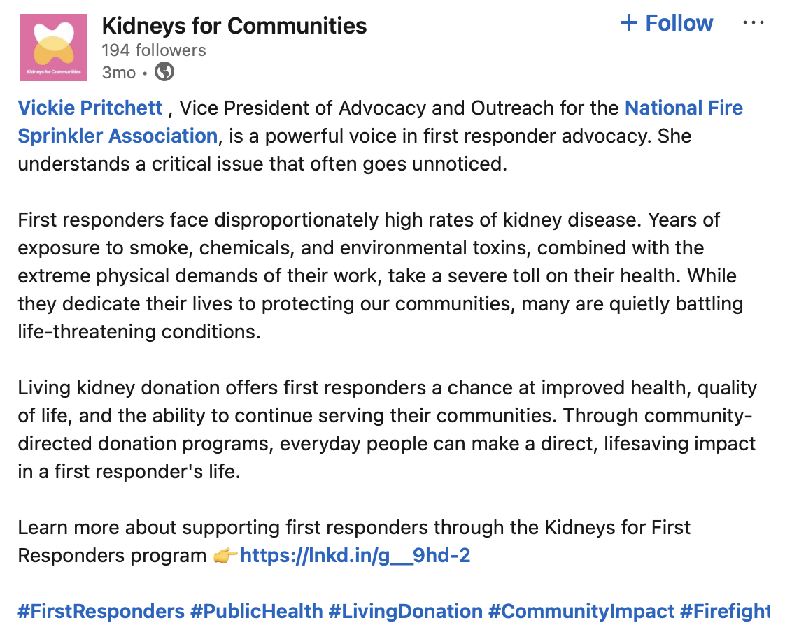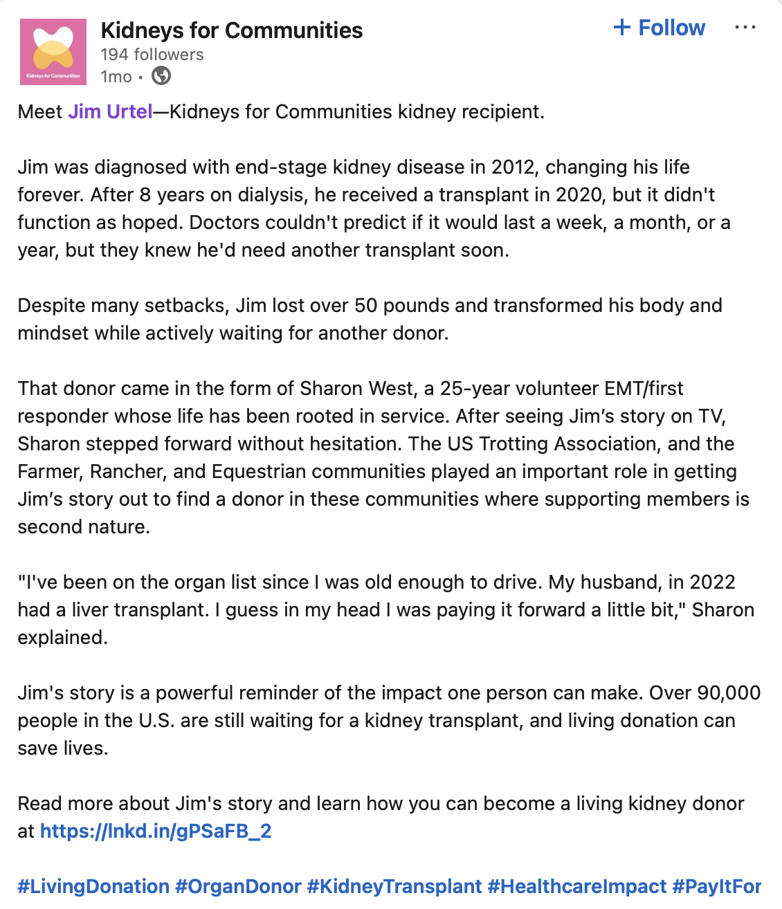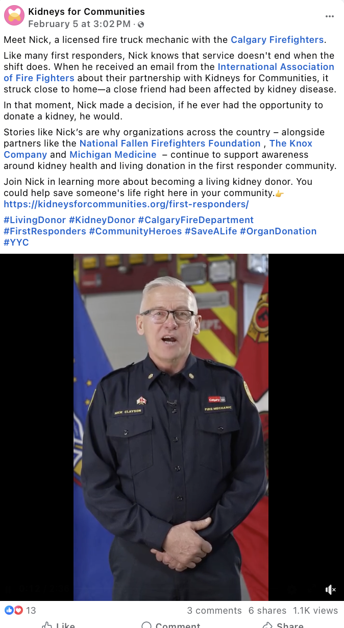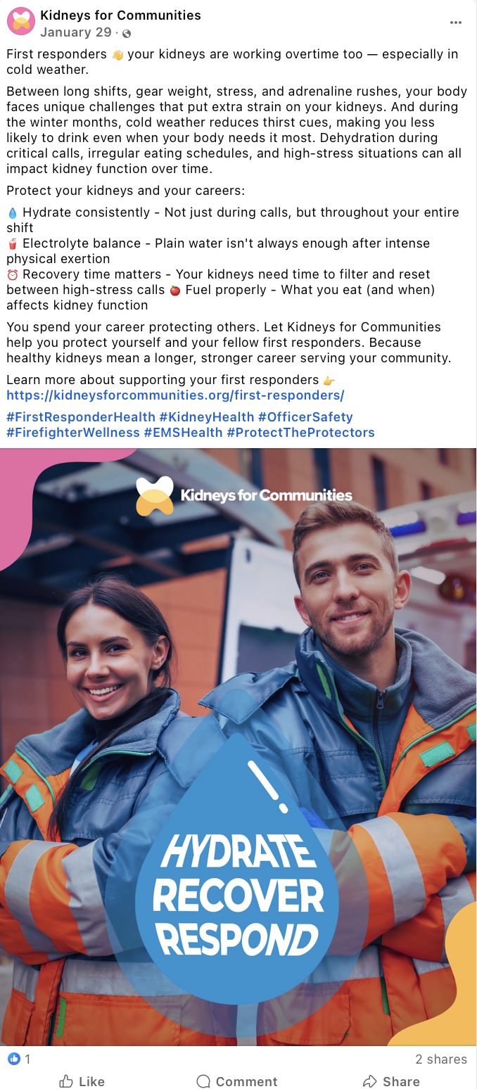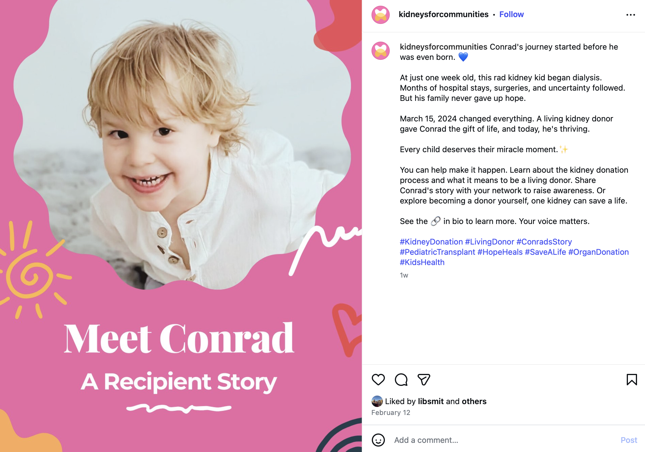 As the social media support for Kidneys for Communities — a nonprofit dedicated to building community around kidney donation and kidney health awareness — I helped implement their social strategy to drive program awareness. Over the course of my time supporting K4C, the content I created across Facebook, Instagram, and LinkedIn contributed to a 23% increase in followers and a 9.35% increase in engagement across all platforms.